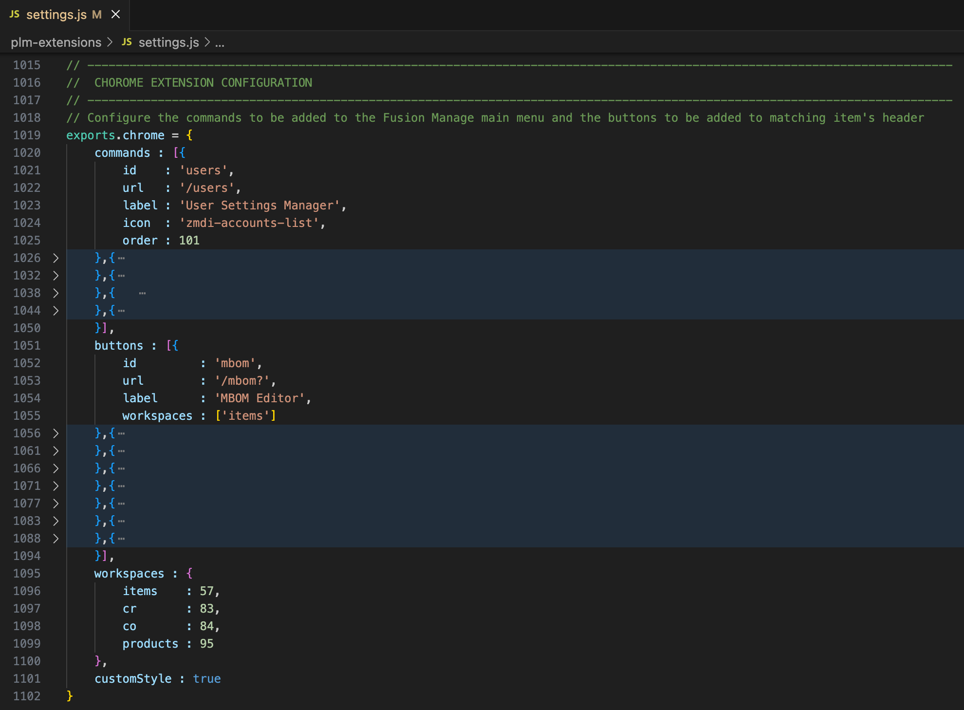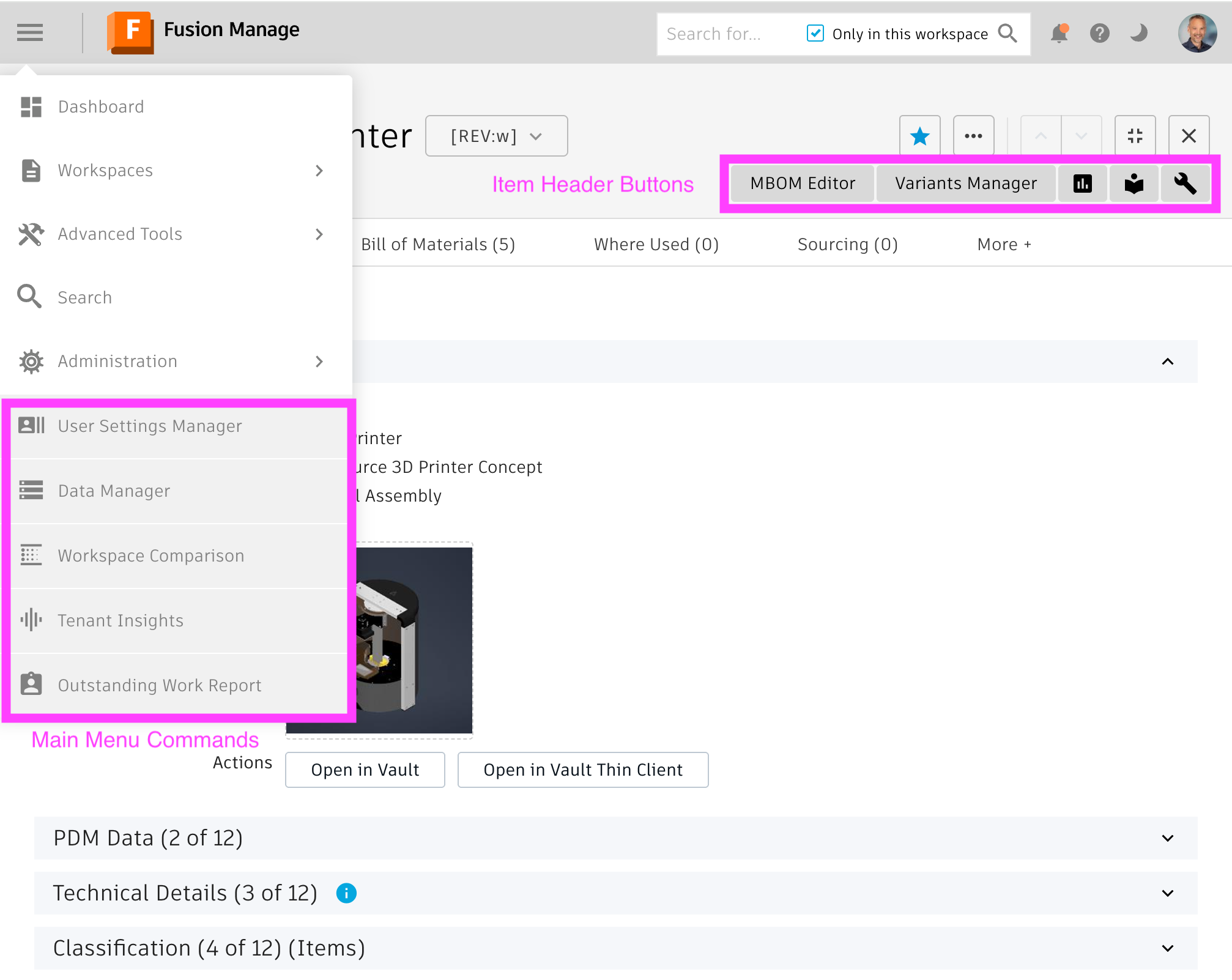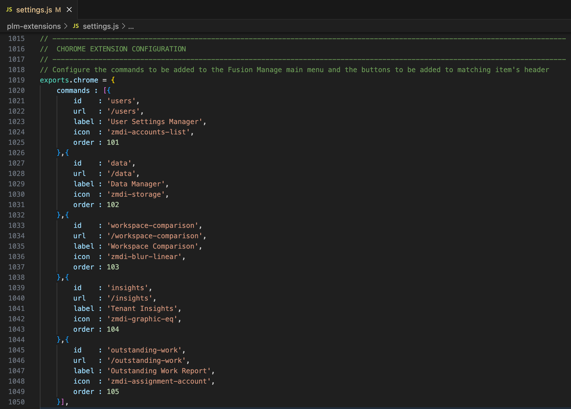 The commands property defines the list of commamds being added to the main menu of Fusion Manage. These commands will only be shown if the user has admin permission in the tenant as this list contains the Administration Utilities of the PLM UX Extensions only. Each command is defined by the following settings: