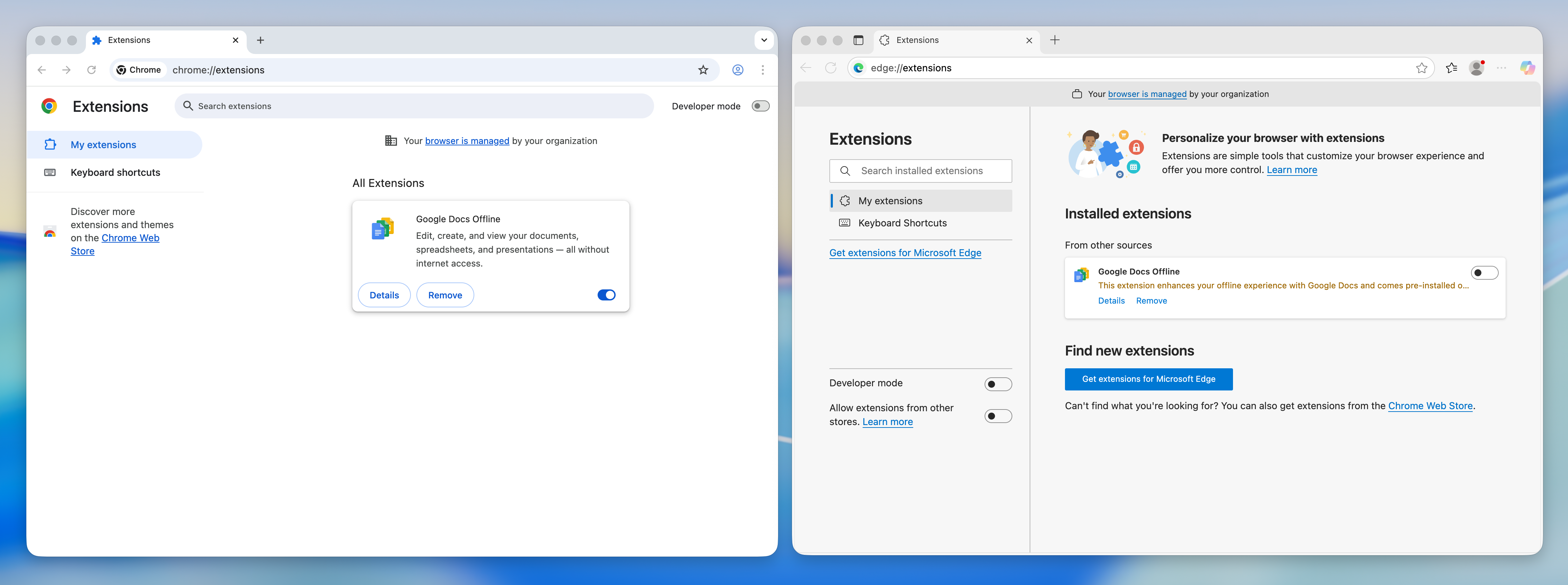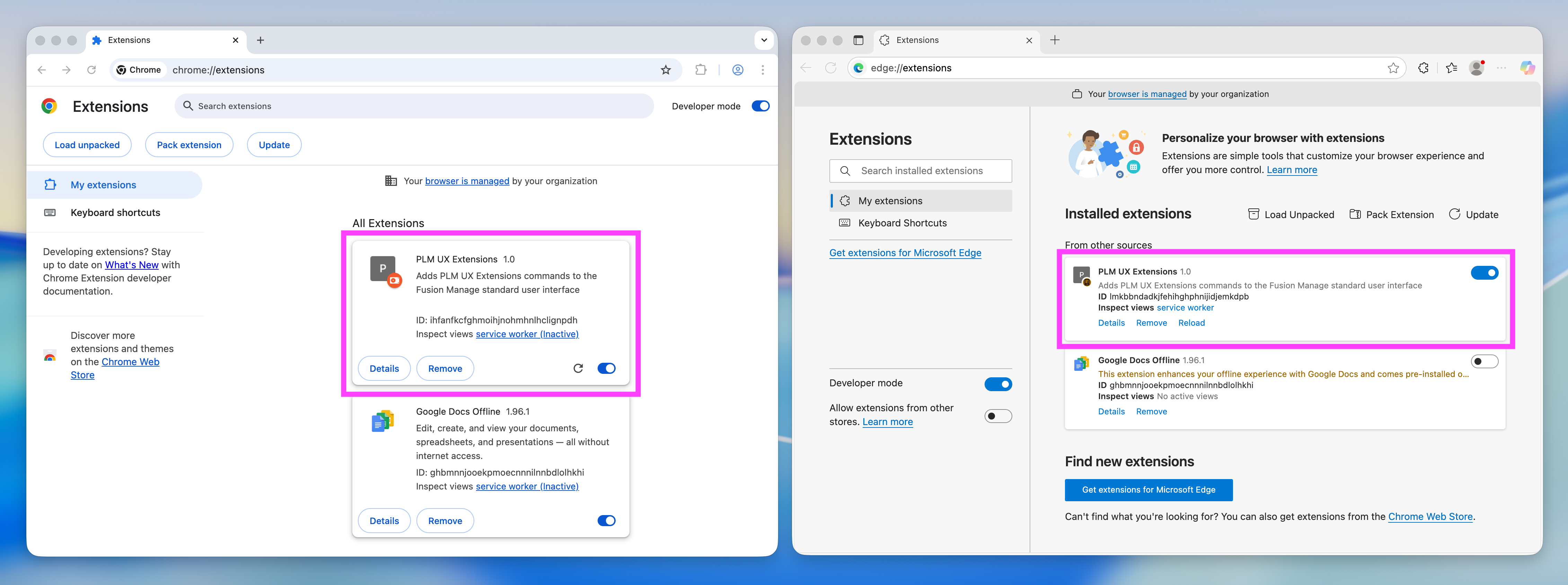 Ensure that the URL of your PLM UX Extensions server is listed in here. Note that while you can list multiple PLM UX Extensions servers in here, only one can be active. The active server is selected in the options dialog of the Chrome Extension as described in a later step. To install this package as next step, open the Extensions control of your browser by opening the address chrome://extensions either in Google Chrome or Microsoft Edge: