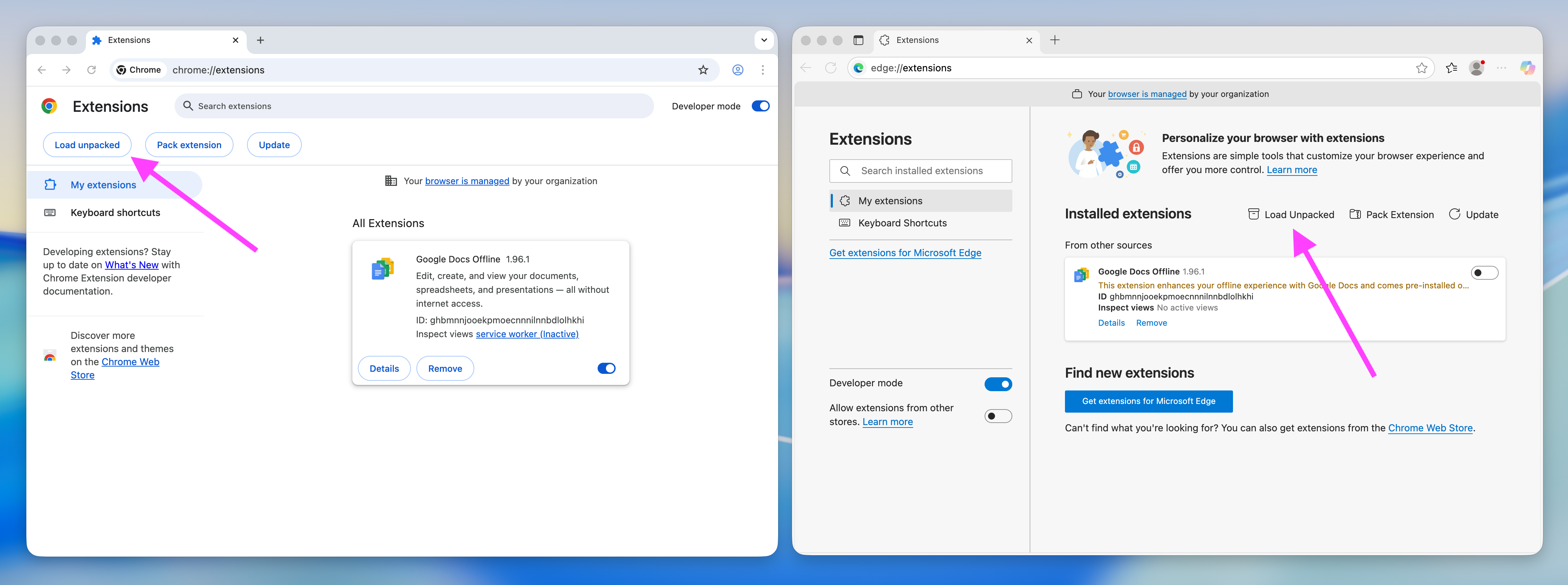 This will enable the features to install an extension from local disk and provide the new button Load Unpacked: