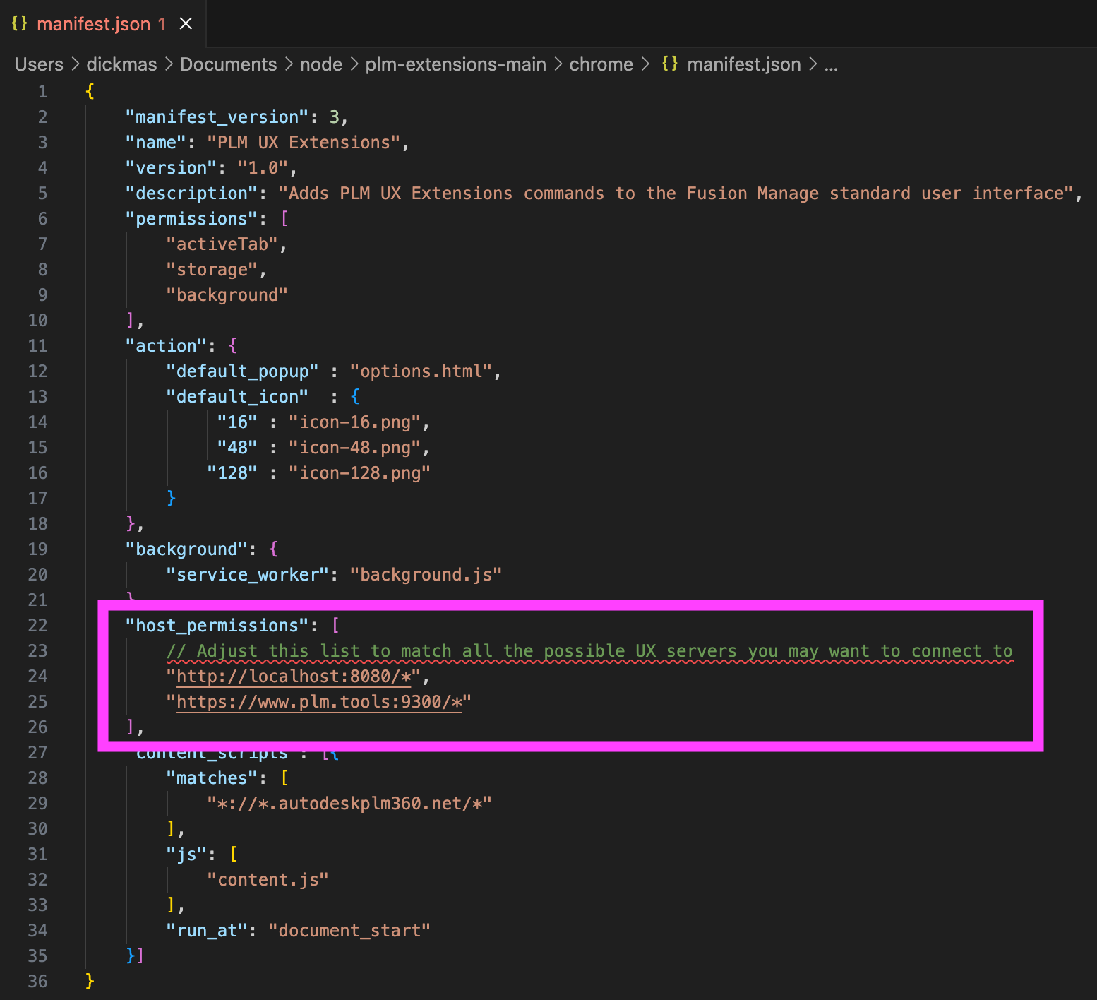 The installation files of the browser extension can be found in folder chrome contained in the PLM UX Extensions server folder. This folder also contains the file manifest.json which defines the access permssion / security of this extension that will be applied by your browser. For example, this file also defines the pages that can be accessed in the background to drive dynmic contents. As the additional commands and buttons are dynamically driven by the PLM UX Extensions server, you must ensure that your PLM UX Extensions server is listed as permitted host. So open the file /chrome/manifest.json and review of servers in host_permissions: